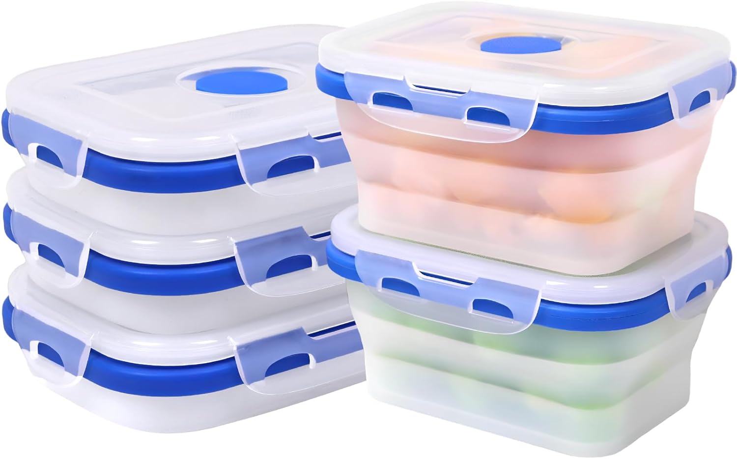 FUSMYE translucent silicone food storage conatainers collapse down while not in use to save up more than 60% of space and help keep you organized. FUSMYE Silicone food containers are 100% BPA and BPS-free, so it’s safe for you and your family. They’re microwave, dishwasher, and fridge/freezer safe making leftovers and cleanup a breeze. The top valve can be closed to seal contents inside the containers or opened to vent air out as well. This keeps food fresher for longer and is great for use in the microwave. [Specifications]: wrapped package includes 5 containers with 5 lids. [Dimensions]: 27oz (800ml) ---- 7.5 x 4.9 x 2.9 in [Material]: Lid – Made of food grade PP that is BPA free and food safe. Each lid includes a premium silicone air valve. Container – Made of top-quality food grade silicone. Use & Maintenance: Safe for: Microwave, Dishwasher, Freezer Avoid putting extreme pressure on the containers when full. Easy to clean. Can wash with warm water and soap or throw it in the dishwasher for a hassle-free experience. Recommend pulling out the air vent valve on the lid or remove the lid prior to heating for best meal heating experience. Check the air valve is pushed back in all the way prior to snapping the lid on the container for best sealing pressure. Eco-Friendly: FUSMYE containers are reusable and excellent for taking home leftovers from a night out, camping, everyday lunch use. Can help save the planet from single use containers.