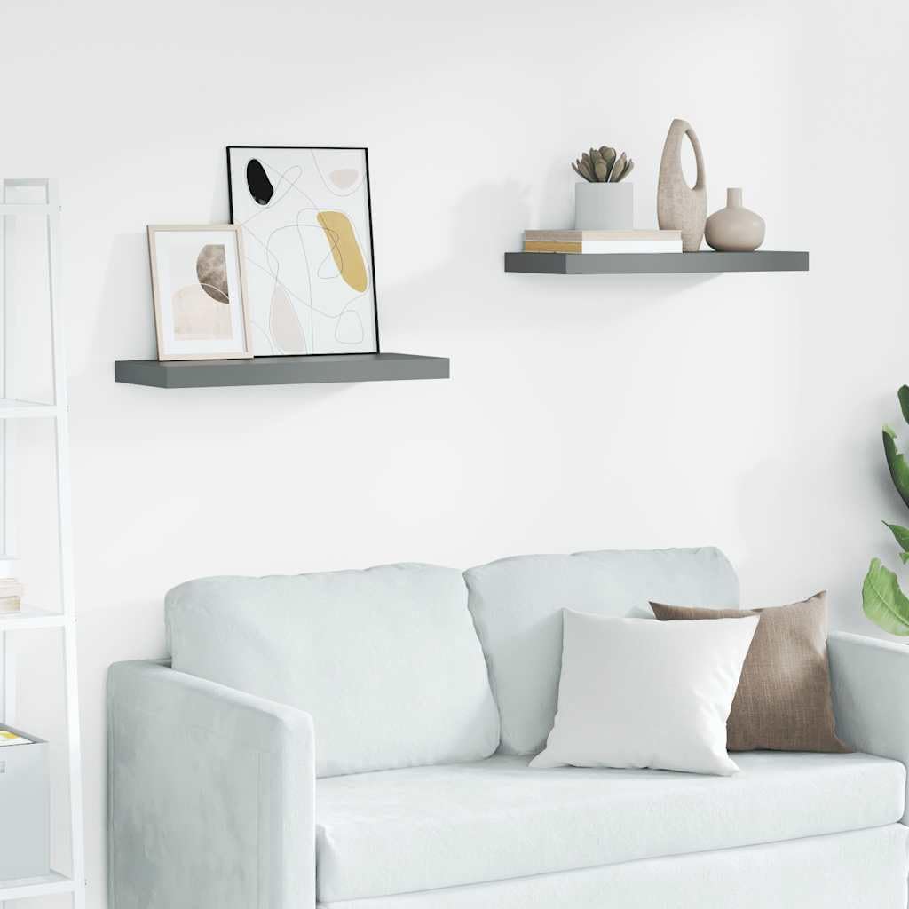 Upgrade your interior with this versatile set of 2 floating wall shelves, designed to combine functionality with modern aesthetic appeal. These square shelves provide the perfect platform to display your cherished books, ornaments, or small indoor plants, helping you create a personalized gallery wall in any room of your home.Finished in a stylish gray hue, these shelves seamlessly integrate into various decor themes, from contemporary to farmhouse styles. The sturdy MDF construction ensures long-lasting durability, while the hidden mounting design provides a clean look that helps to declutter your living space and maximize your vertical storage capacity.Installation is quick and easy, with all required mounting components provided in the package. Whether you are looking to add a functional accent piece to your bedroom or a decorative touch to your living room, these floating shelves are an excellent choice for a organized and stylish home environment.